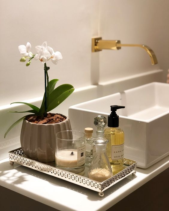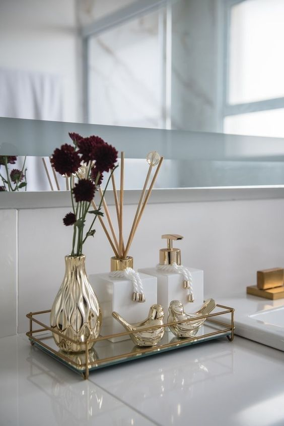 A gold bathroom tray adds a touch of luxury and sophistication. The gleaming sheen of the gold elevates the tray’s appearance, making it a striking and elegant choice. This tray ensures your bathroom decor is both refined and eye-catching.