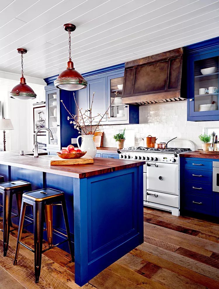 Add warmth and boldness to your farmhouse kitchen with rich colors. The deep royal blue cabinetry contrasts with reclaimed wood floors and butcher-block countertops, which provide a durable and natural texture. Glass-front cabinets showcase attractive dishes, while copper pendant lights add a touch of shine. The cast-iron range, styled like an old-fashioned stove, is topped with a custom zinc hood that will gracefully develop a patina over time.