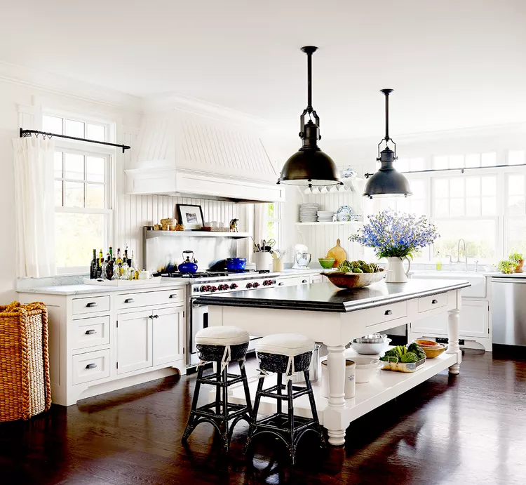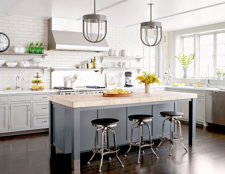 In an authentic farmhouse kitchen, practicality is key. Open shelves display everyday dishware for easy access and organization. A butcher-block island at the center of the space offers rustic charm and a practical prep surface.