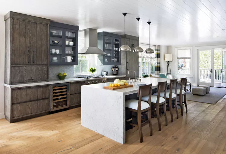Infuse your kitchen with a timeless, aged charm by incorporating natural materials. Reclaimed white oak beams stretch across the ceiling, while dark slate tiles with a tumbled edge add a vintage feel to the floor. Carrara marble countertops contrast beautifully with vintage-style bronze faucets and hardware, which will develop a patina over time. Modern, commercial-grade appliances blend seamlessly with the kitchen’s antique elements, balancing the old and new. Instead of a traditional island, a large farmhouse table takes center stage, perfect for family gatherings.