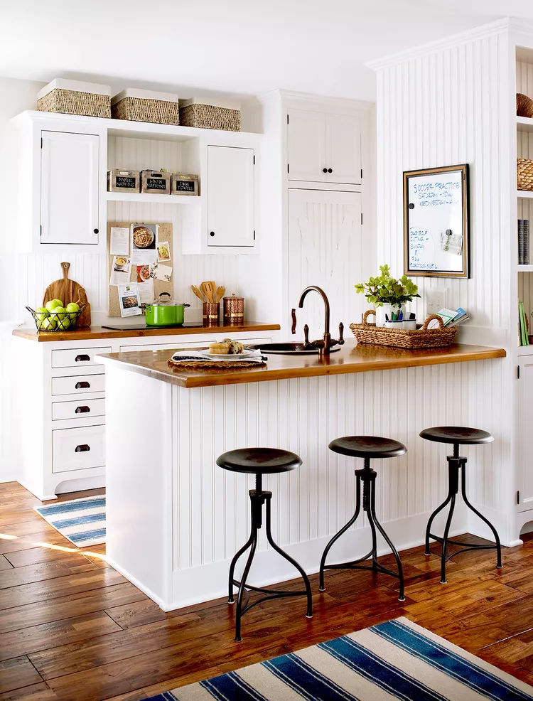 Vintage-inspired features lend a charming farmhouse appeal to this kitchen. Beaded-board panels, reminiscent of a turn-of-the-century porch, add beauty and texture to the island, backsplash, pantry door, and walls. Wood countertops and classic stools contribute to the inviting ambiance.