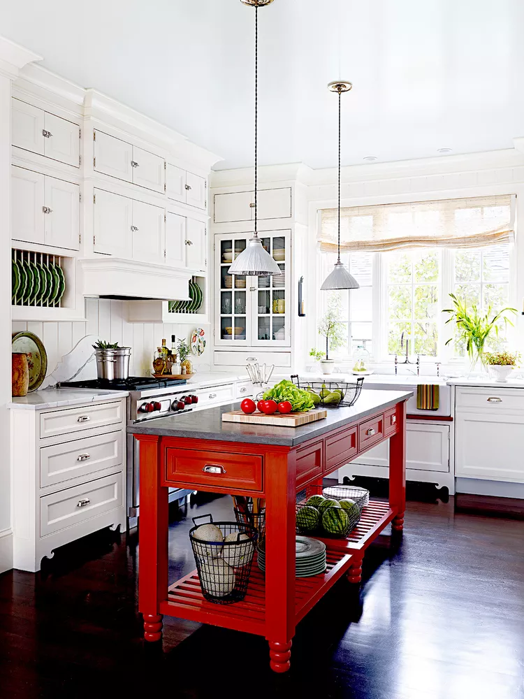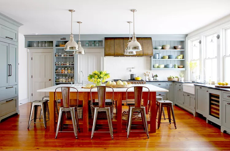 Introduce freestanding pieces to your farmhouse kitchen for a sense of evolution. An island designed as a table, with turned legs, open shelving, and cup-style pulls, serves as a functional and stylish centerpiece. The rusty red color and stone countertop add to the island’s farmhouse charm, complemented by chocolatey wood floors and vintage details like custom bracket feet and a fireclay apron-front sink.