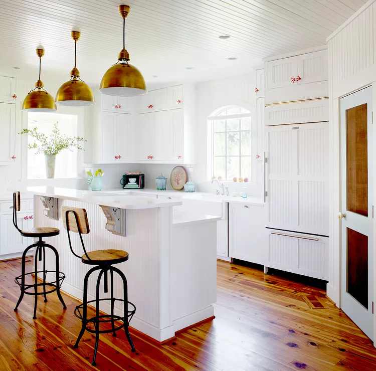 Unique details can set your farmhouse kitchen apart. Beaded-board surfaces, rustic corbels, and stools designed like old schoolhouse chairs create a cozy, cottage-like atmosphere. Antiqued brass pendant shades, a copper pantry door, and coral knobs add vintage touches and playful color.
