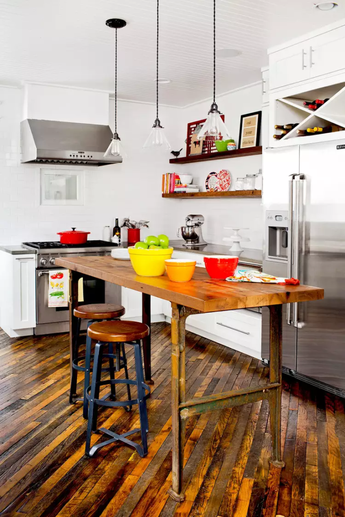 Combine modern elements with the warmth of wood to achieve a welcoming farmhouse style. This kitchen integrates stainless-steel appliances and white cabinetry with a rustic island table featuring a metal base and butcher-block top. Rugged wood shelves and a dark wood floor enhance the blend of old and new.