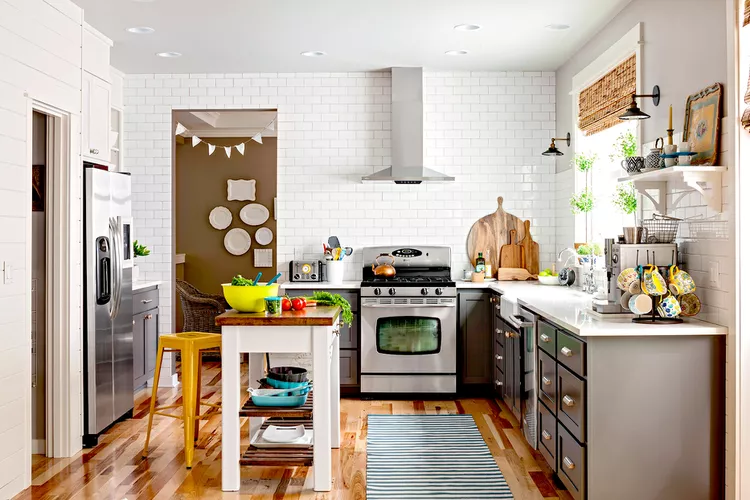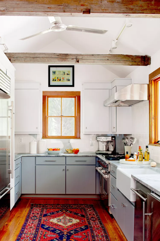 Small kitchens can still exude farmhouse charm with smart design choices. This compact space features gray-blue cabinets that blend with chrome pulls and stainless steel appliances. Salvaged beams add rustic character, while a red kilim rug provides vintage color and pattern.
