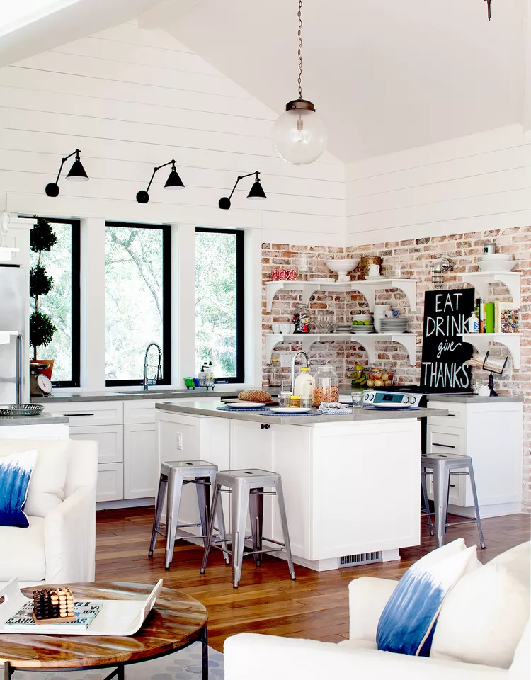 Effective wall treatments can enhance your farmhouse kitchen’s appeal. Exposed brick adds rustic color and texture, while white-painted shiplap above brightens the space. Grille-free windows allow natural light to flood in and highlight backyard views.