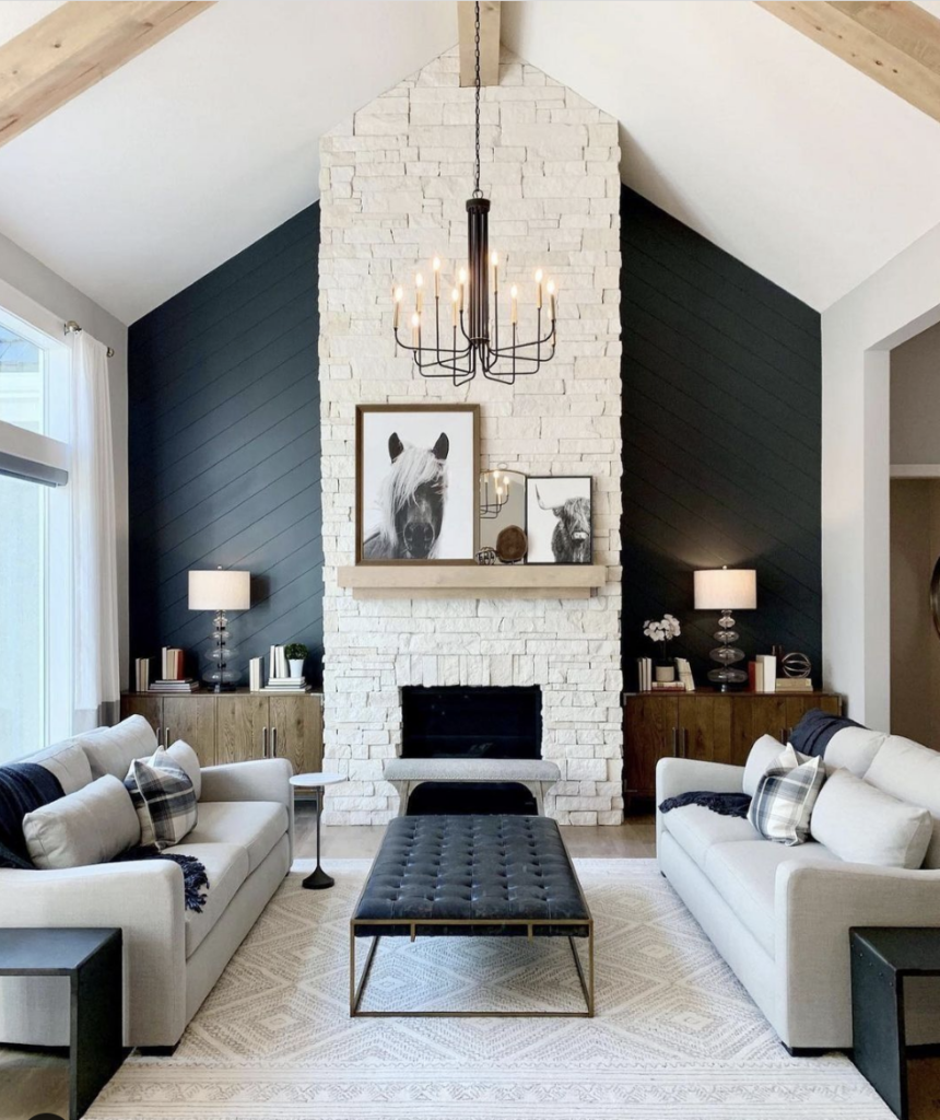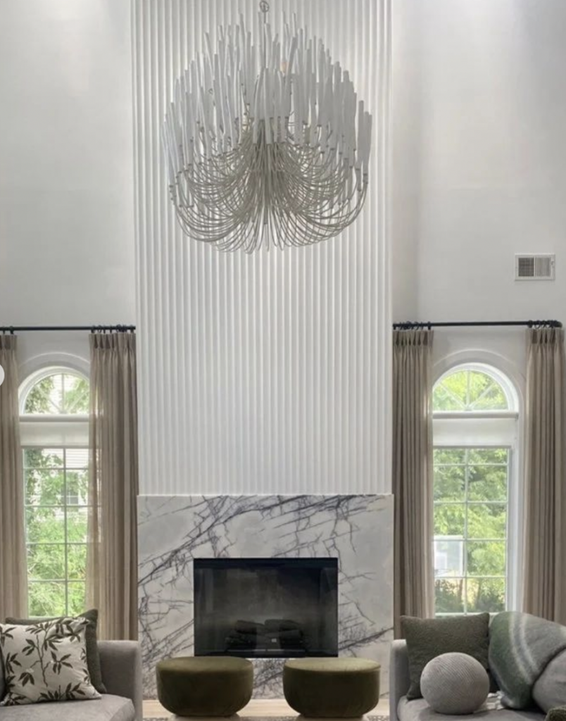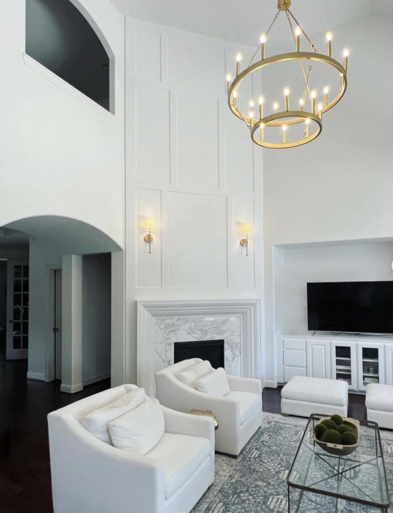 Combining a two-story fireplace with a board and batten wall creates a visually striking backdrop. The vertical and horizontal boards of the wall add texture and depth, enhancing the fireplace’s prominence. A gold chandelier above adds a touch of sophistication, blending traditional elements with contemporary elegance.