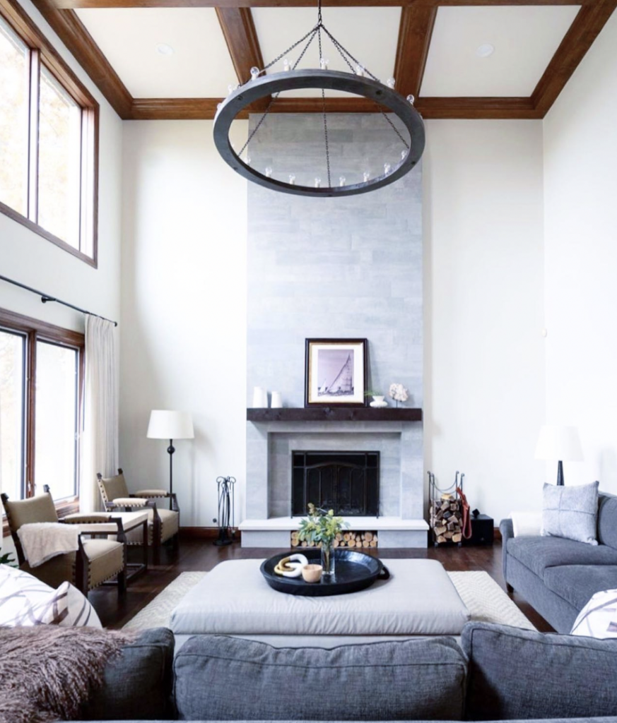 Grey Fireplace Wall For Tall Ceiling Living Room