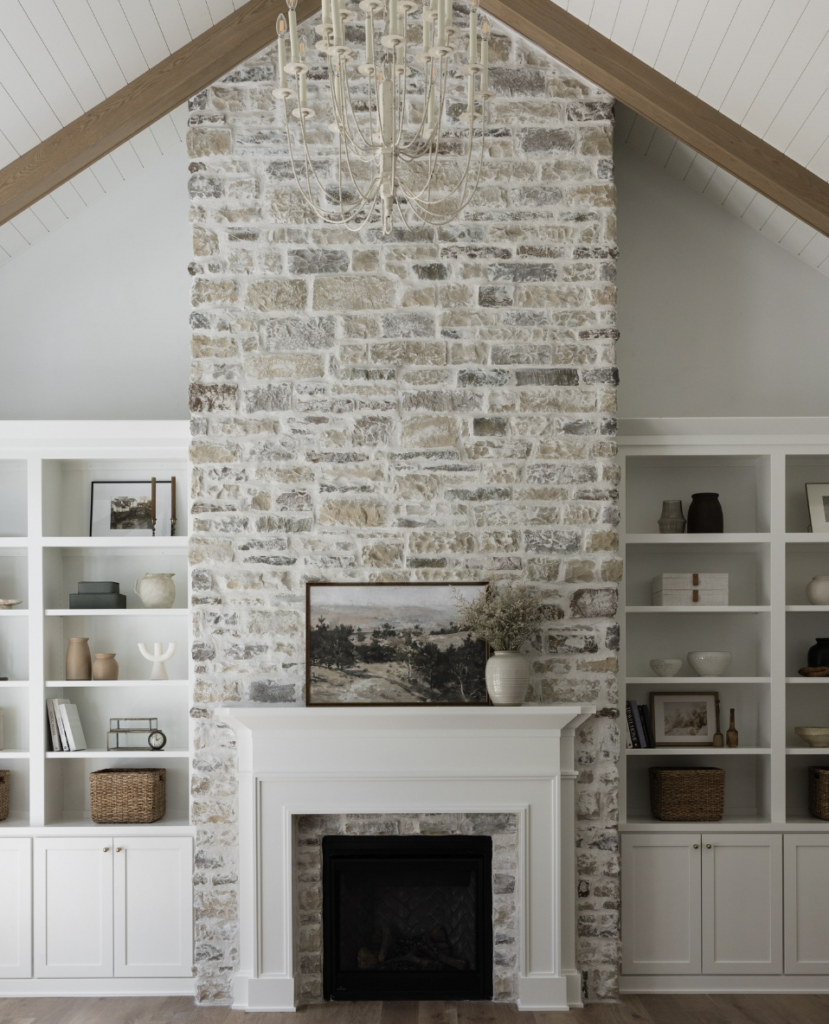 Brick has long been a cherished material in home design for its timeless appeal. A brick fireplace wall, complemented by built-in shelves, creates a warm and inviting focal point. The rich, earthy tones and texture of the brick bring a sense of tradition and coziness, making it ideal for creating a snug, welcoming space.