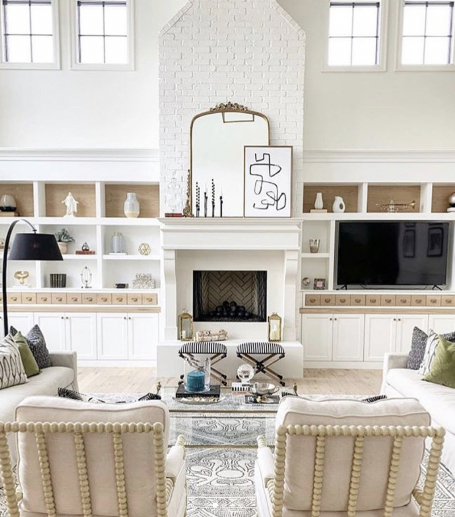 A distressed white-painted brick fireplace wall offers a durable and low-maintenance option. The resilient surface withstands wear and tear, making it ideal for families. The distressed finish adds a touch of character, blending practicality with aesthetic appeal.