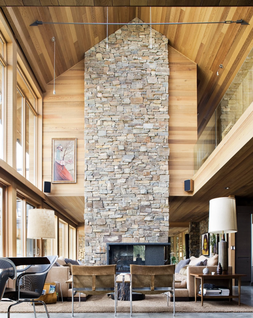 A natural two-story stone fireplace is both functional and artistic, showcasing unique textures and colors. Each stone contributes to the fireplace’s individuality, adding natural beauty to the space. The variety of stone types, from rustic to smooth, provides versatile design options that complement various decor styles.