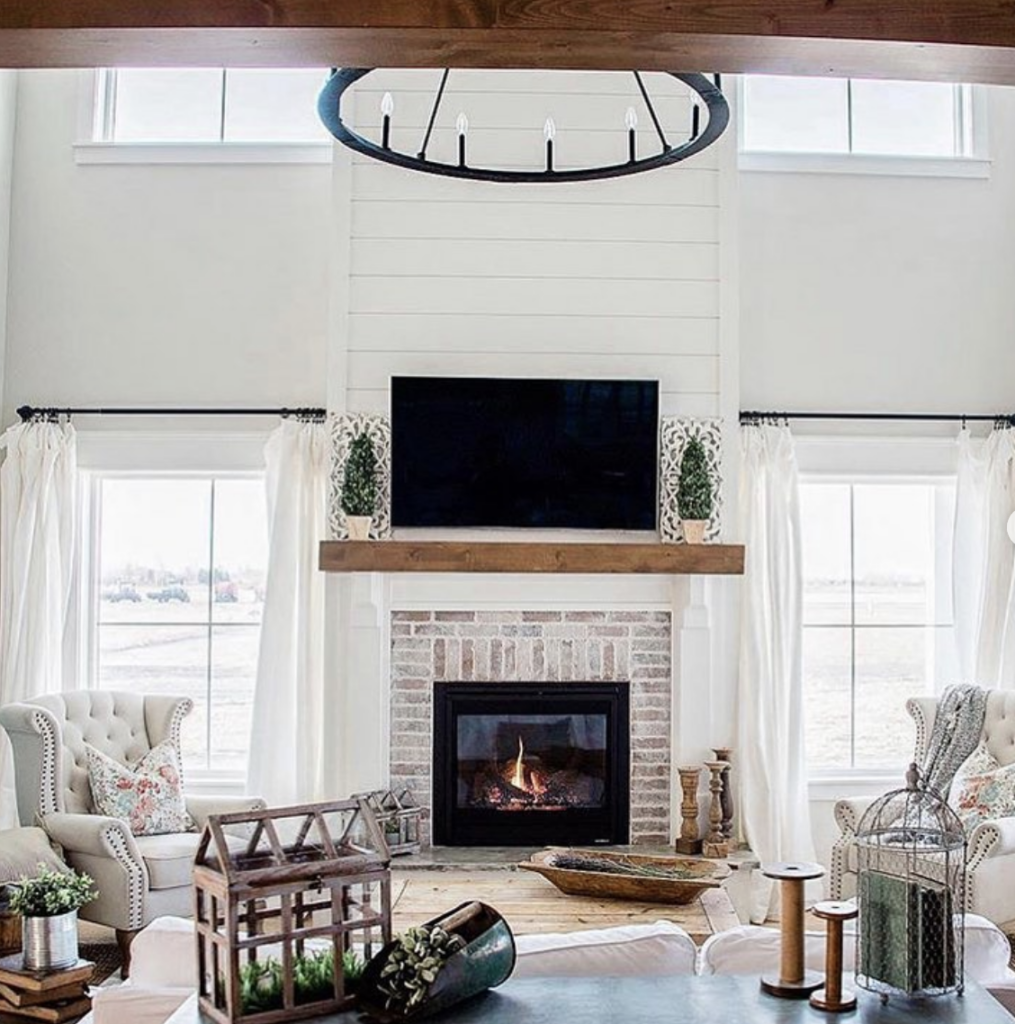 A red brick mantel contrasts beautifully with a shiplap wall, combining traditional and rustic elements. The warm, earthy tones of the red brick provide a striking visual anchor against the smooth, white shiplap. This combination adds depth and character to the fireplace area, enhancing the overall design.
