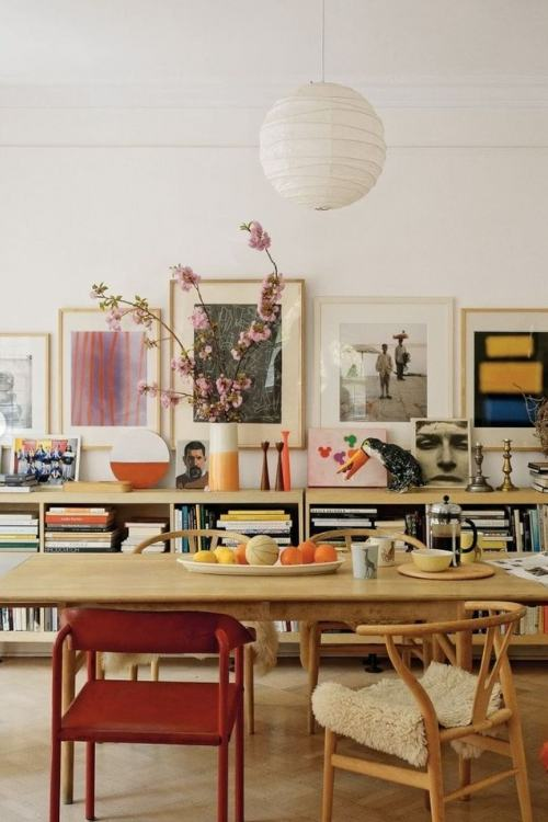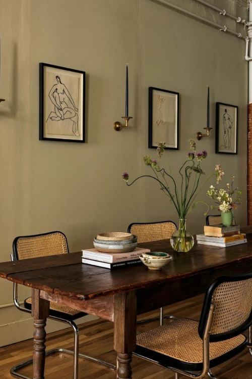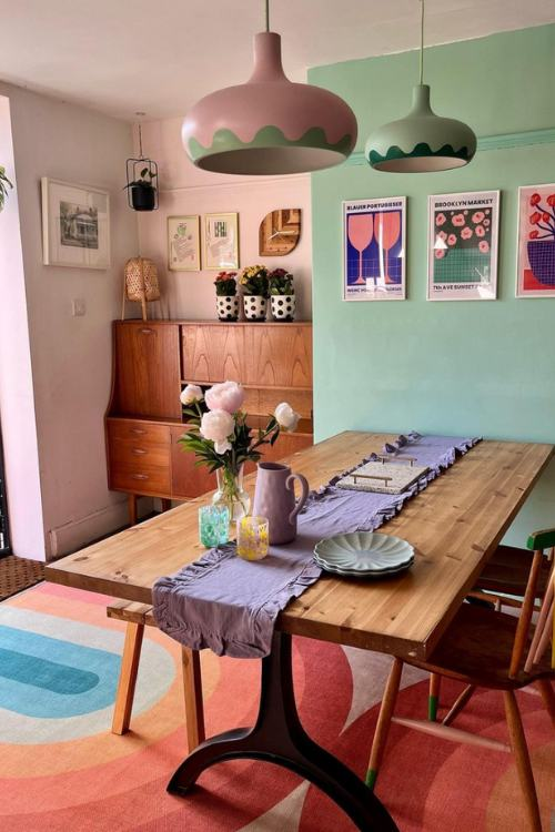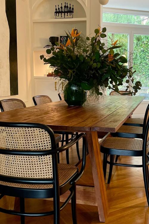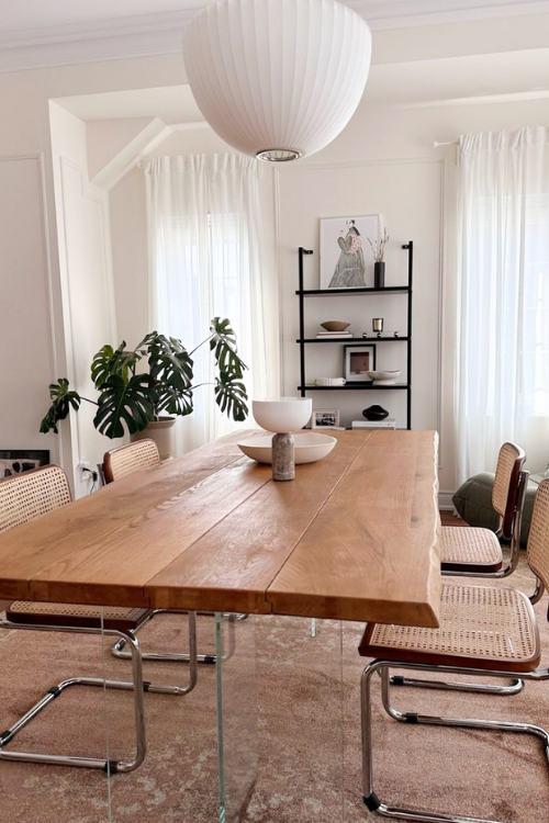 Mix vintage and contemporary furniture, and don’t hesitate to pair mismatched chairs around the table. Incorporate lush plants and greenery to infuse the space with vitality and freshness.