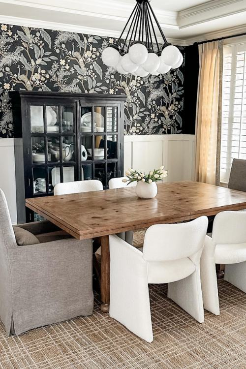 Bold printed wallpaper can dramatically transform your dining room. Select a pattern that resonates with your style, whether it’s floral, geometric, or abstract.