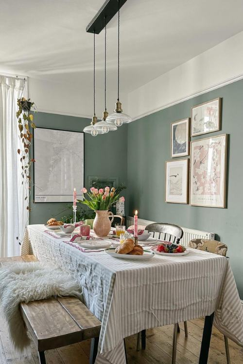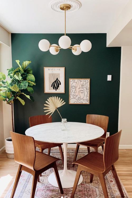 Sage green is a calming and versatile color that can bring a touch of nature into your dining room. Paint your walls sage green to create a serene and welcoming atmosphere.