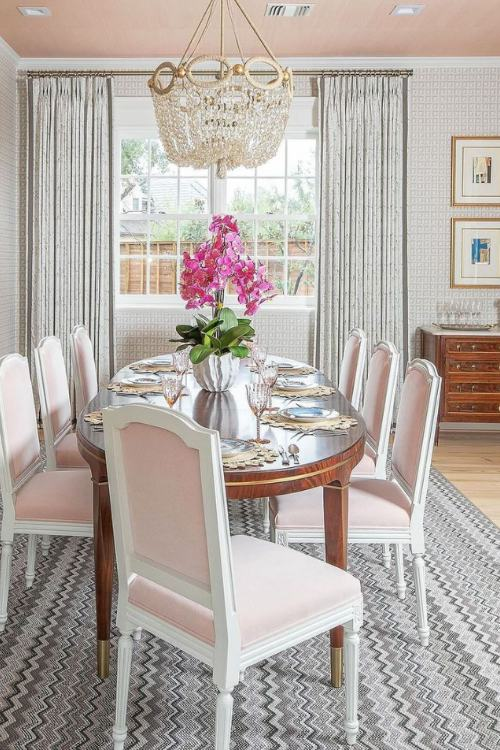 For a playful and unexpected twist, consider painting your dining room ceiling pink. A soft blush pink can add warmth and charm, while a more vibrant shade can create a bold effect.