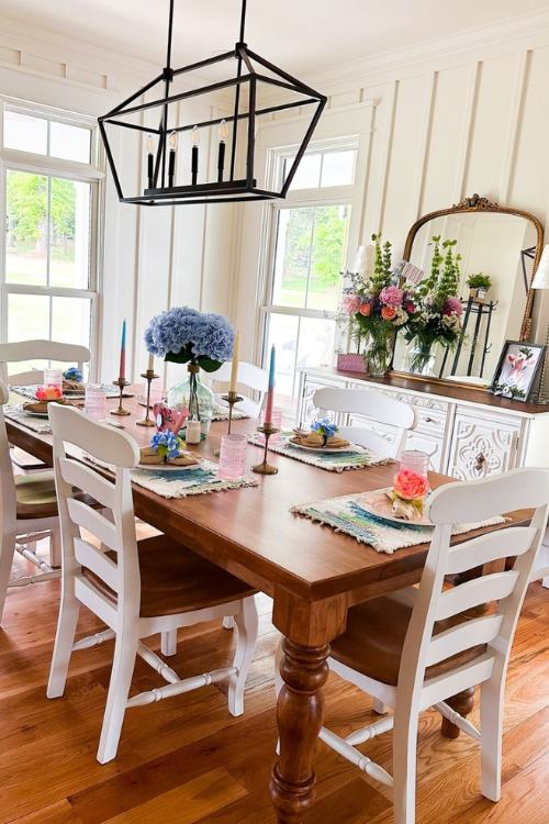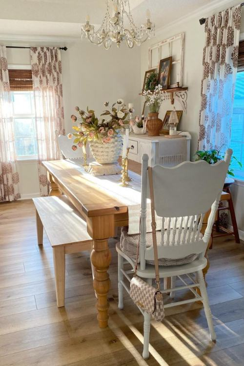 A farmhouse dining room exudes coziness with its blend of rustic and vintage elements. Look for a farmhouse table with vintage details or a distressed finish, and pair it with a mix of wooden chairs and benches.