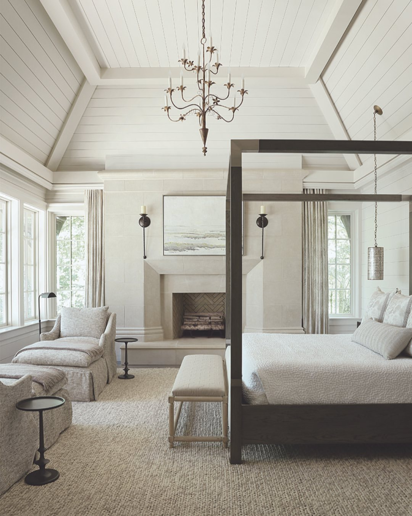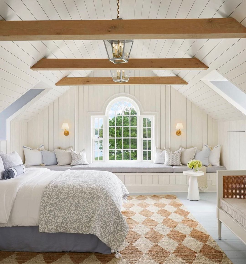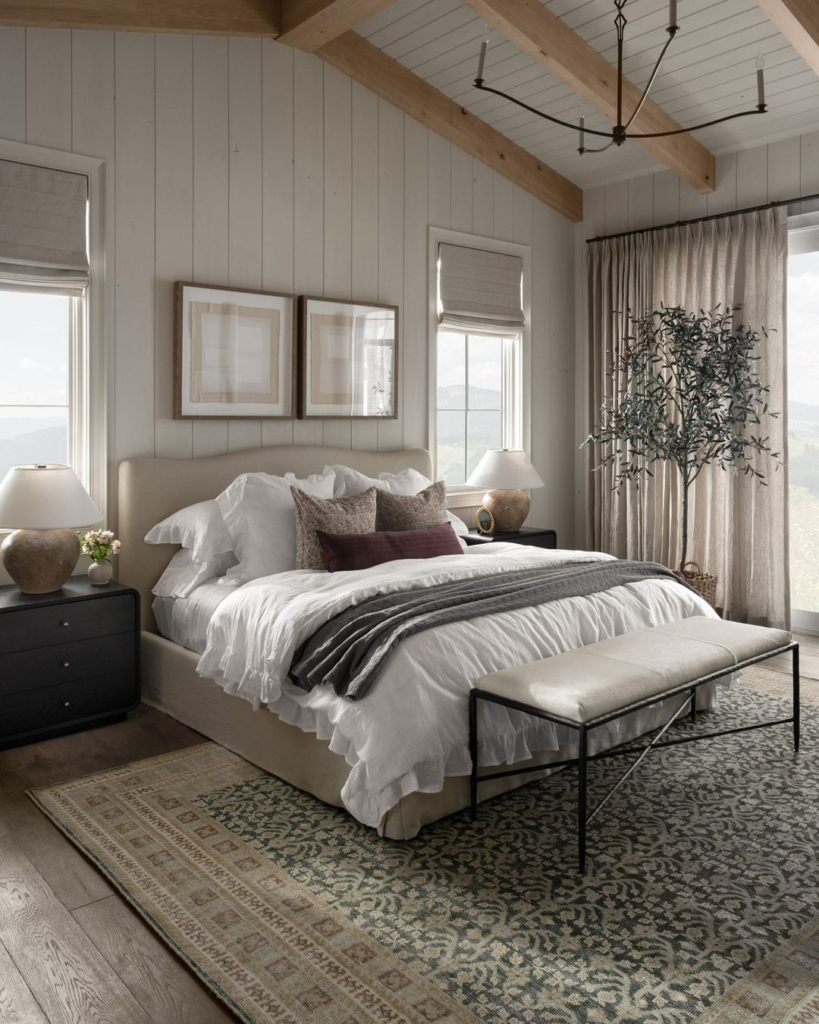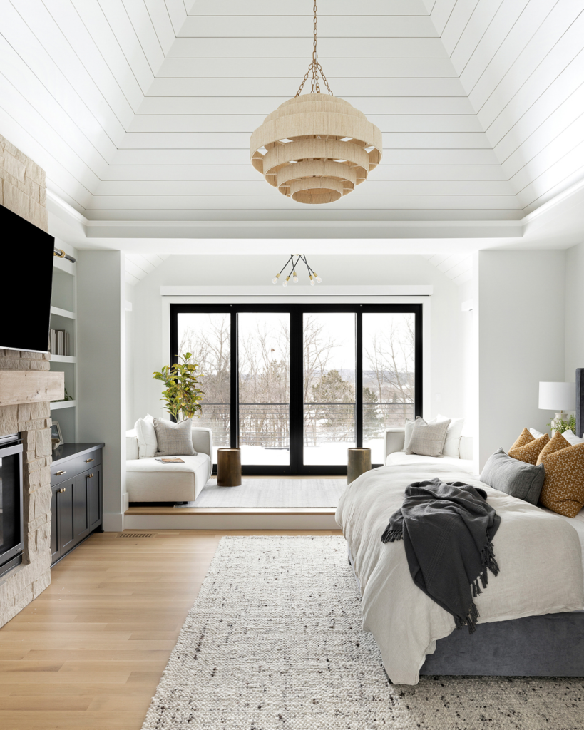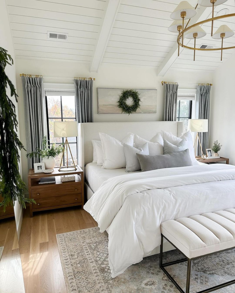 White shiplap ceilings create a rustic yet airy feel. A bold gold chandelier offers a modern contrast to classic lines. Neutral tones and natural textures ground the space. Together, they form a serene, vaulted bedroom retreat.