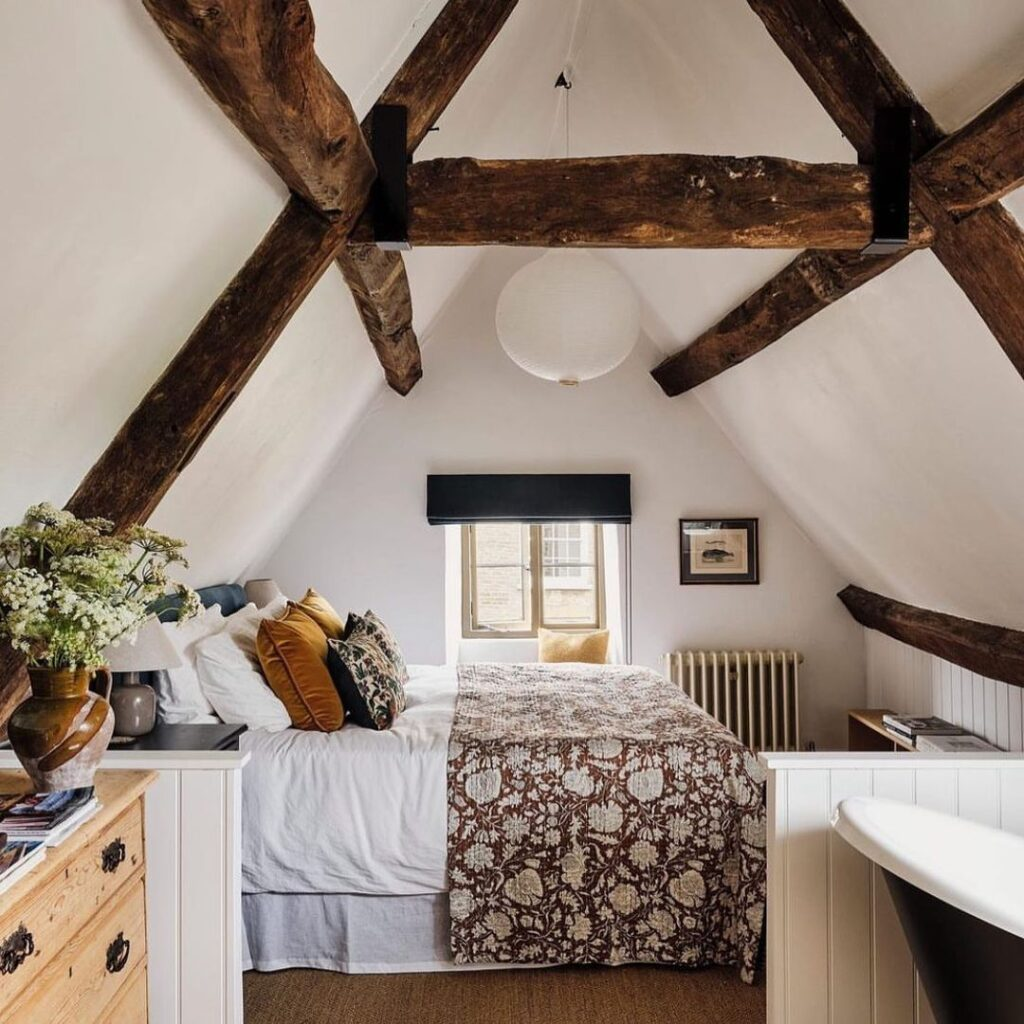 Dark, hand-hewn beams offer a dramatic contrast to light walls, emphasizing the vault’s peak. The snug dimensions are made grand with the exposed structure. Simple furnishings and earthy tones complement the historical vibe, merging rustic charm with an intimate scale in a vaulted setting.