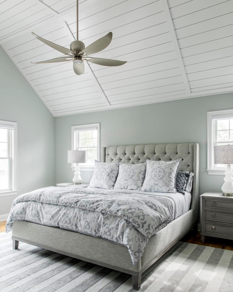 Soothing pale blue walls and a white vaulted ceiling create a calming atmosphere. A luxurious tufted headboard adds a plush touch. A sleek fan offers a modern twist to traditional ceiling beams, creating an elegant bedroom that invites relaxation under its vaulted canopy.
