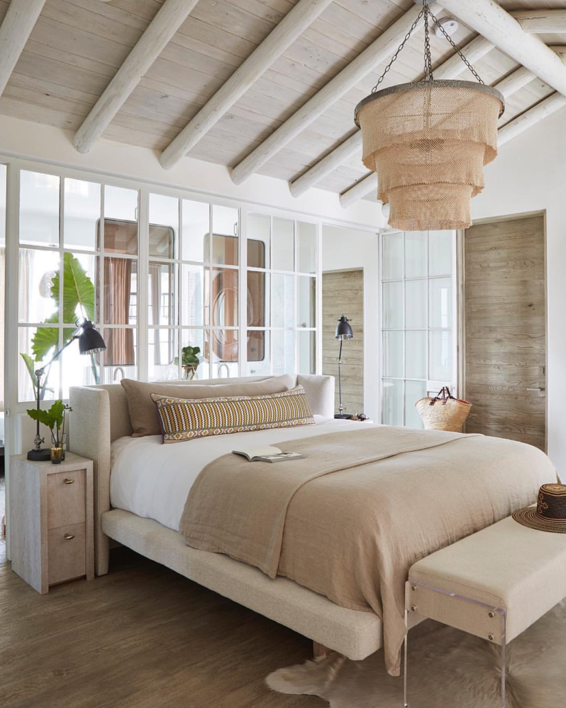Rough-hewn beams and a burlap chandelier introduce rustic textures to this coastal-themed vaulted bedroom. Full-height mirrors reflect natural light, enhancing the spacious feel. Neutral tones and natural fabrics create an inviting and serene atmosphere, perfect for relaxation.