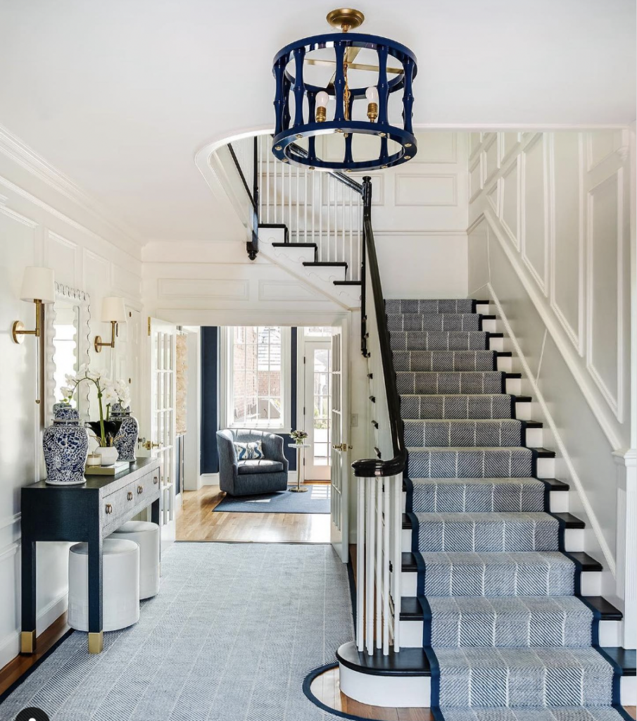 A blue carpet runner paired with a coordinating light fixture adds a touch of elegance and cohesion to your entryway. The blue runner introduces a vibrant yet sophisticated pop of color, while the light fixture complements it, enhancing the space’s overall design. This combination not only enhances visual appeal but also protects your flooring and ensures a welcoming atmosphere.