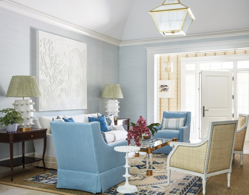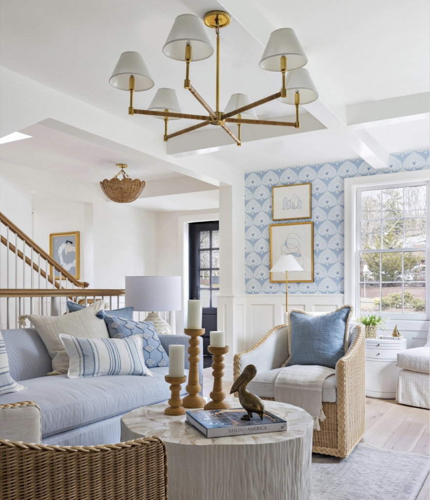 White Living Room With Wainscoting And Blue Patterned Wallpaper