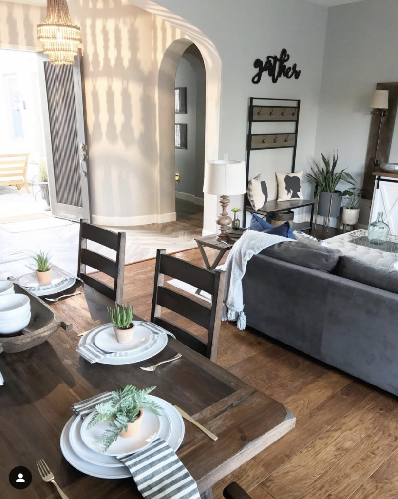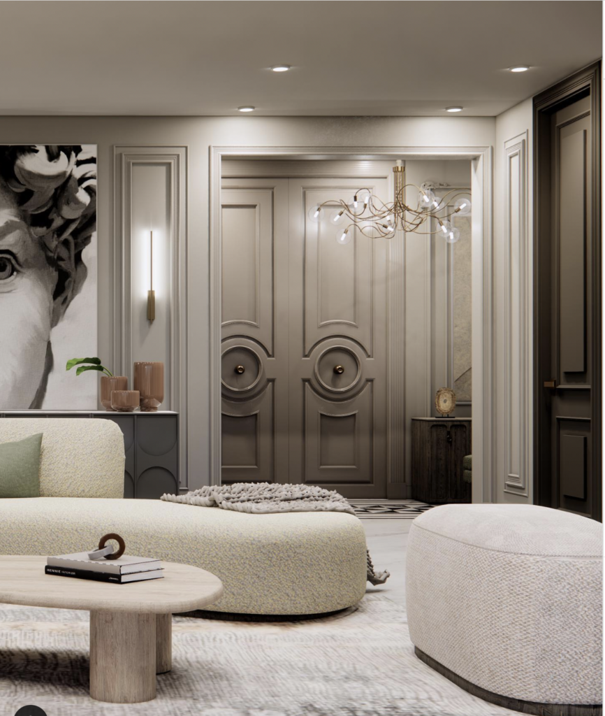 A white double front door introduces a sense of grandeur and openness, especially when paired with a grey couch in the living space. Grey serves as a neutral backdrop, allowing you to easily experiment with different accent colors and patterns. This setup offers flexibility in design, ensuring that the living area remains stylish and adaptable.