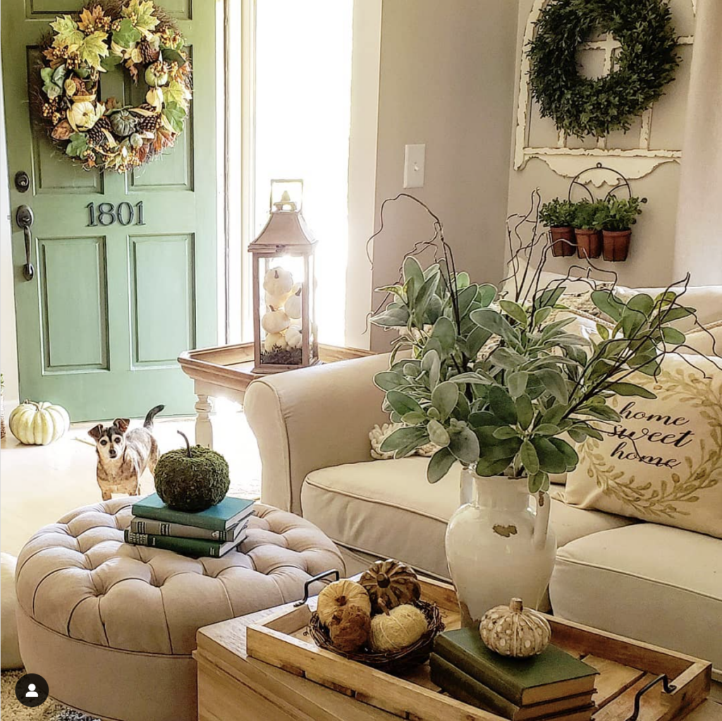 Embrace the cozy vibes of fall by decorating your living room with a green front door. This color choice evokes the essence of the season, while fall-themed decor like pumpkins, warm throws, and autumnal hues create a cozy and inviting atmosphere. The green door acts as a charming focal point, integrating seasonal beauty with your living space’s design.