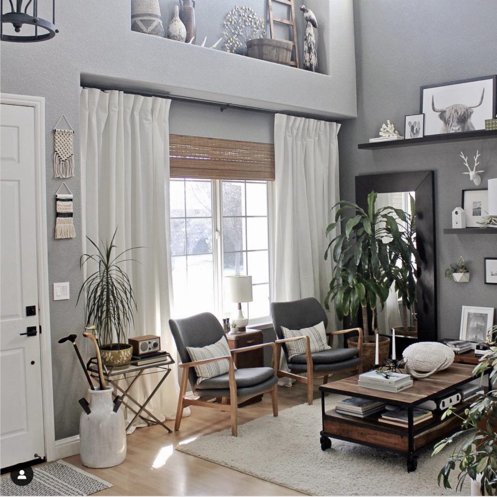 An integrated entryway and living room create a more engaging and sociable environment. Grey walls paired with white curtains offer a neutral yet stylish backdrop that enhances the sense of openness and flow between the two areas. This design approach promotes seamless interaction and makes guests feel at ease as they transition from the entrance to the living space.
