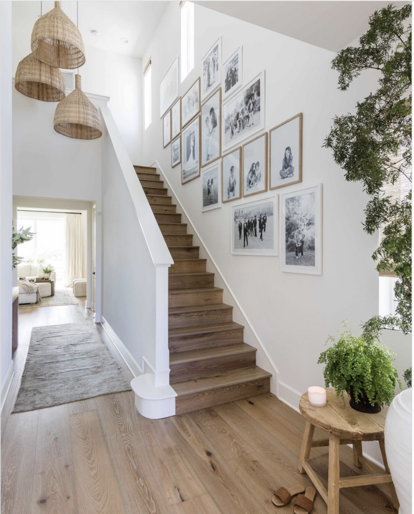 A gallery wall along the entryway stairs adds a personal touch and visual interest to the space. This design choice allows you to display artwork, family photos, or other meaningful items, creating a welcoming and curated experience as you enter your home. The gallery wall serves as a dynamic focal point, enriching the entryway with personality and style.