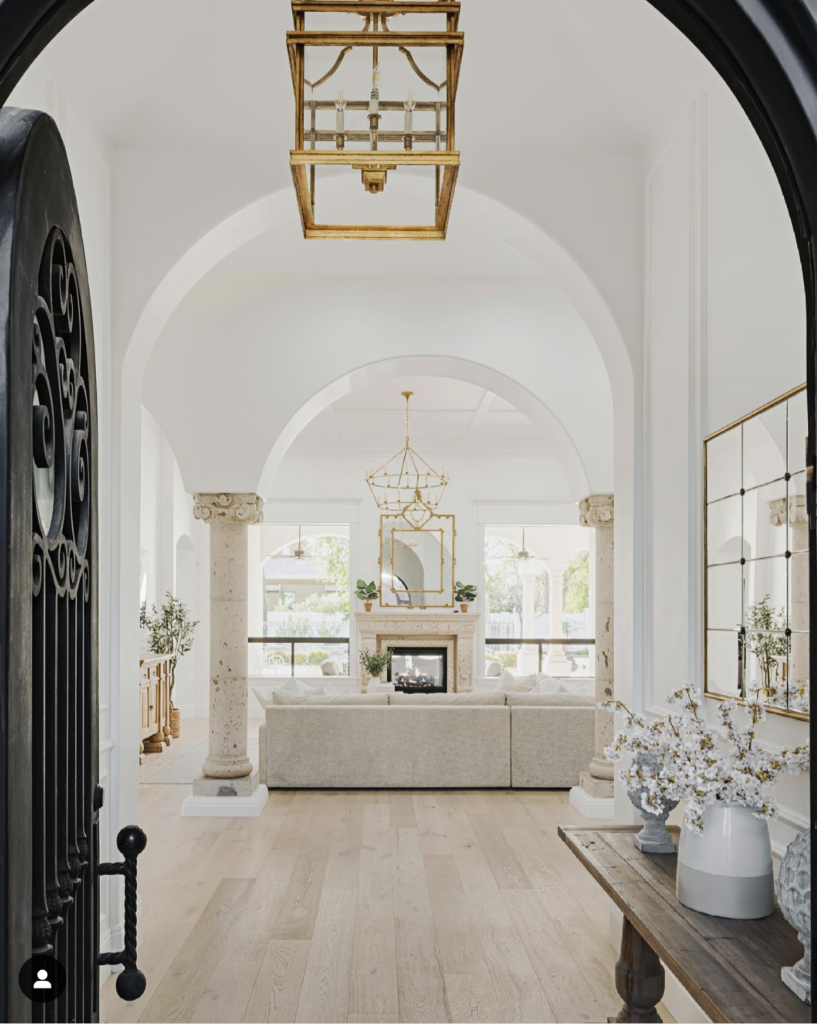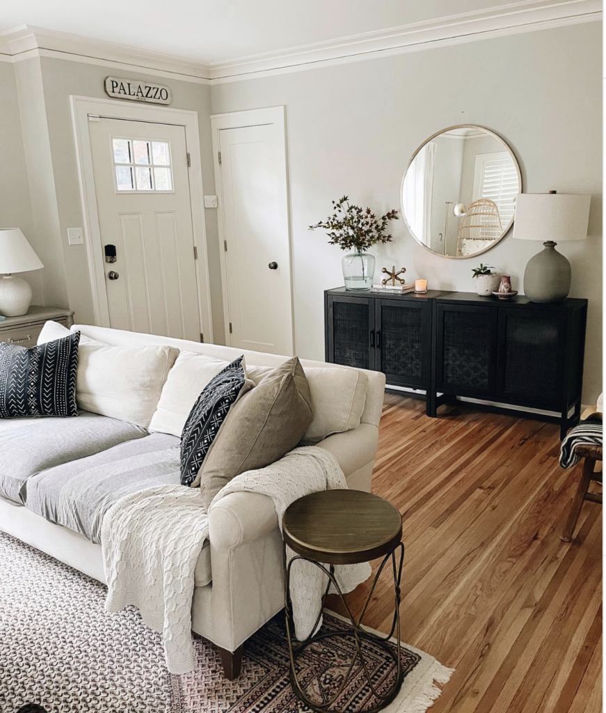 A black front door that opens directly into the living room creates a striking and sophisticated entrance. The door’s dark hue contrasts with lighter interior elements, drawing attention and setting a dramatic tone for the space. This combination of a bold entrance with refined interior design elements enhances the room’s overall aesthetic appeal.