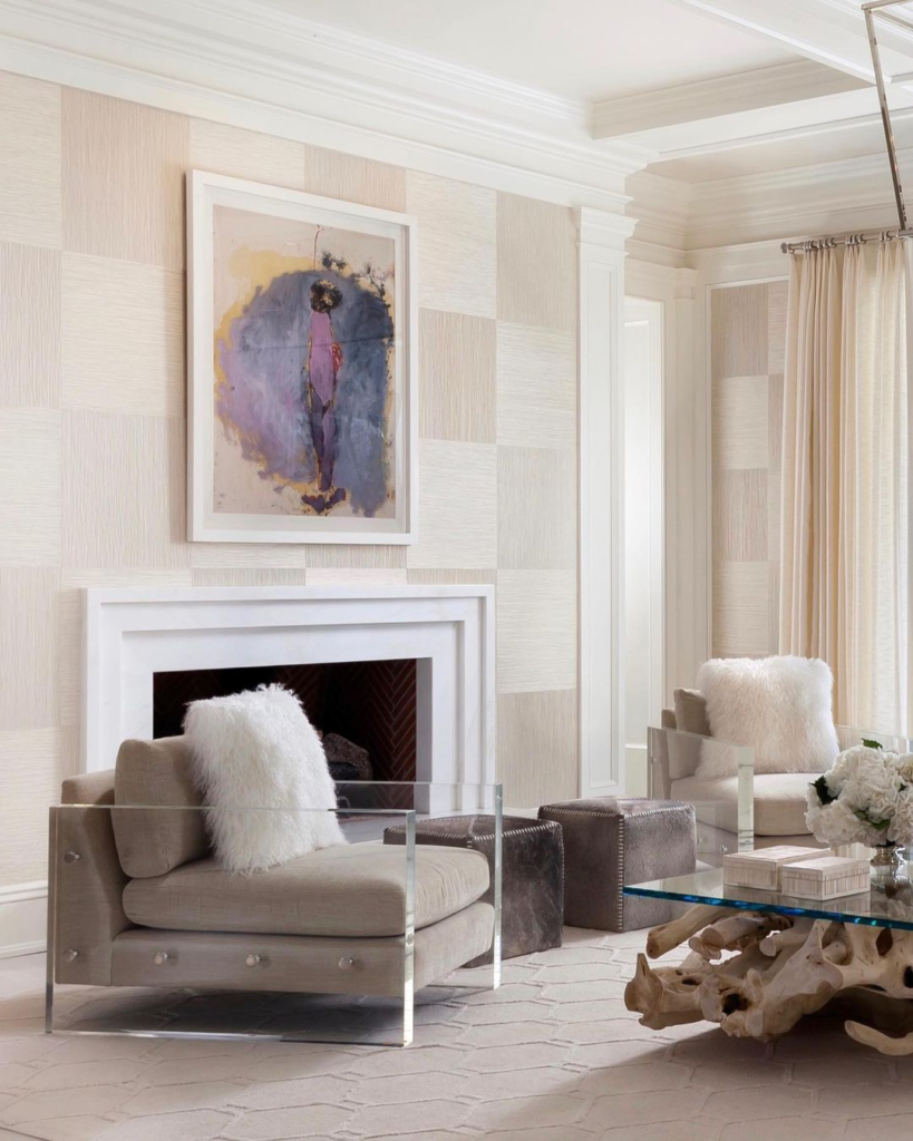 This cream living space channels the artist’s loft, with a striking line drawing taking center stage above the fireplace. The balance of books and decor on the coffee table suggests a lived-in elegance. The soft cream palette is complemented by structured furniture, offering both comfort and culture.
