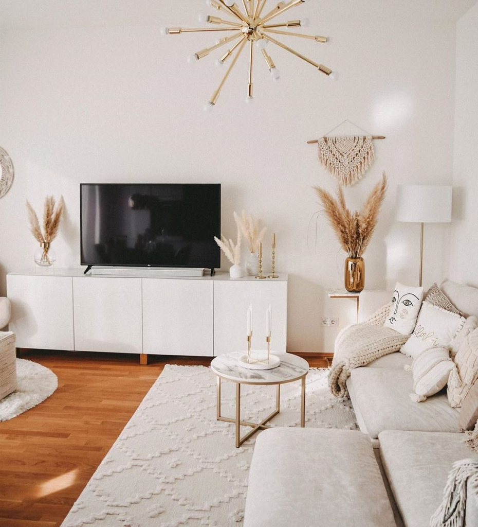 Minimalistic elegance takes center stage in this cream living room, where the clean lines of a low-profile, modular sofa complement the sleek silhouette of a modern media console. A starburst chandelier casts intricate shadows, adding dramatic flair to the otherwise simple setting. The cohesive cream palette is subtly punctuated by touches of greenery and the warm glow of candlelight.