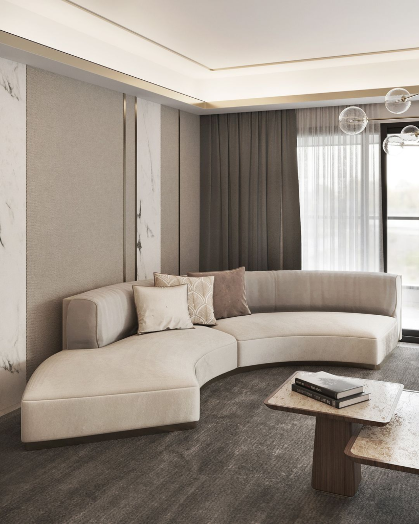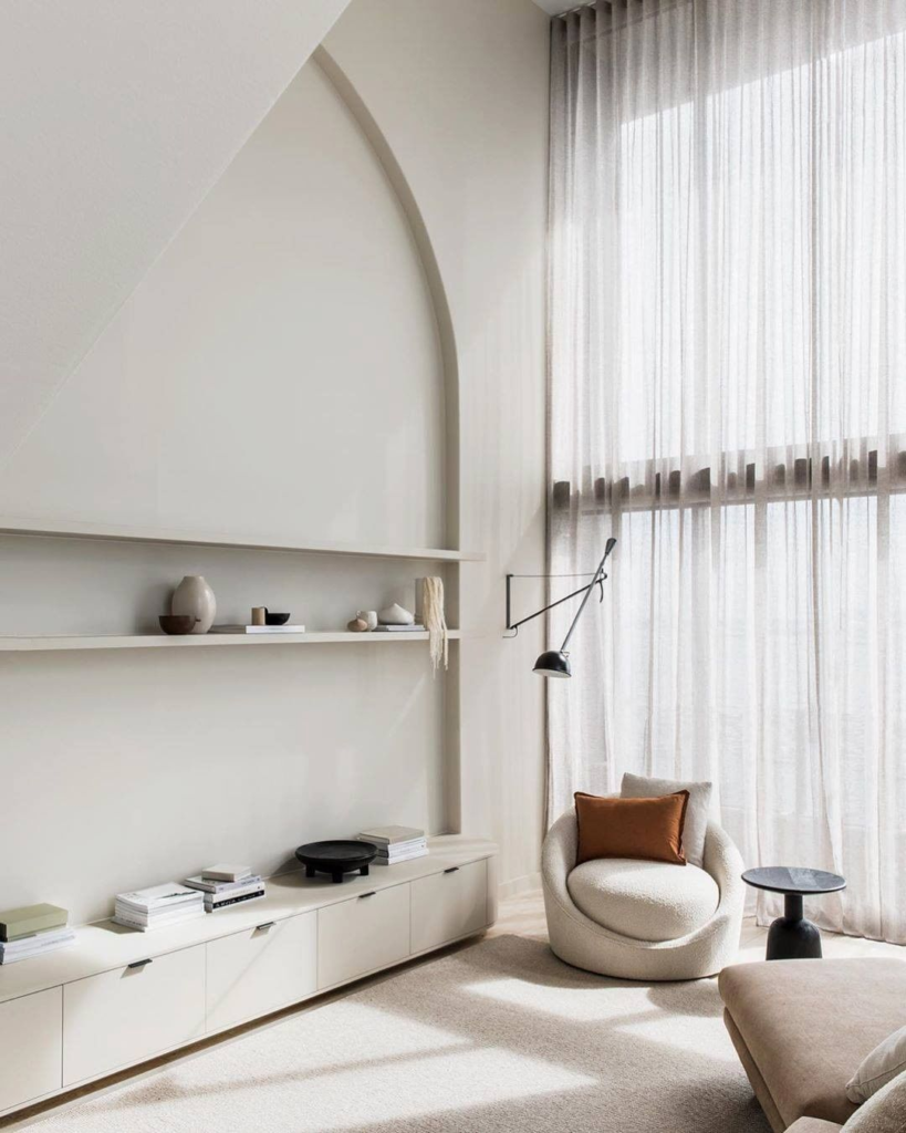 Cream’s versatility shines in this space through curved furniture and soft textures. An elegant lamp arches gracefully, while a minimalist art piece adds sophistication. Each element contributes to a refined, cohesive living space.