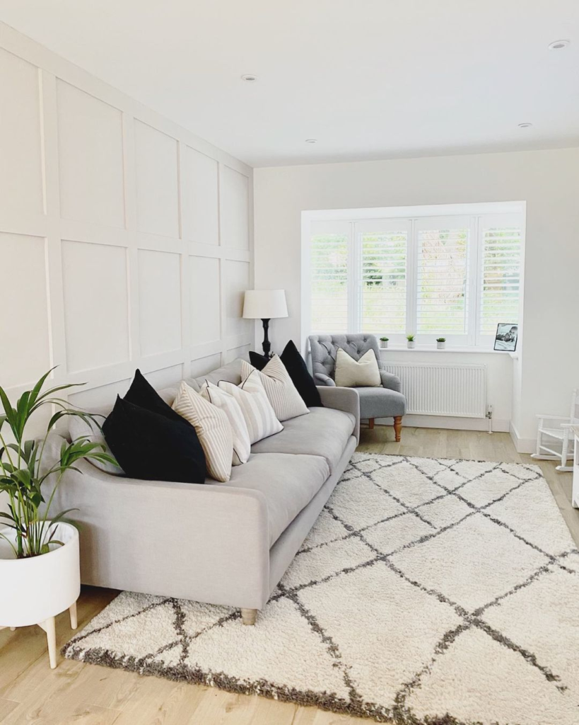 The clean lines of the white paneling in this cream living room exude understated elegance. A sprawling sectional sofa and a plush diamond-patterned rug anchor the space in comfort and style. Subtle gray tones and lush indoor plants inject life and contrast, creating a modern sanctuary.