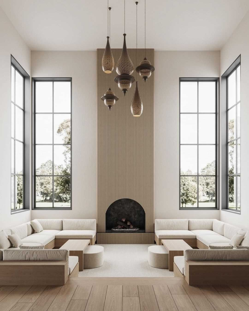 With its lofty ceilings and expansive windows, this cream living room captures a sense of grandeur. Artisanal pendant lights add elegance, while paired sofas offer a structured yet inviting space for socializing. The cream tones provide a backdrop for the textures and forms that make this room a peaceful retreat.