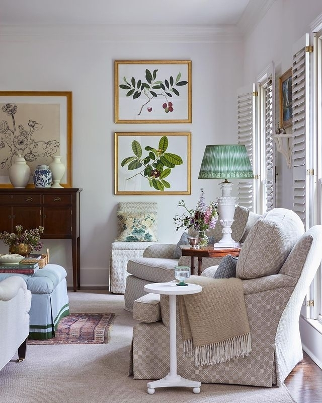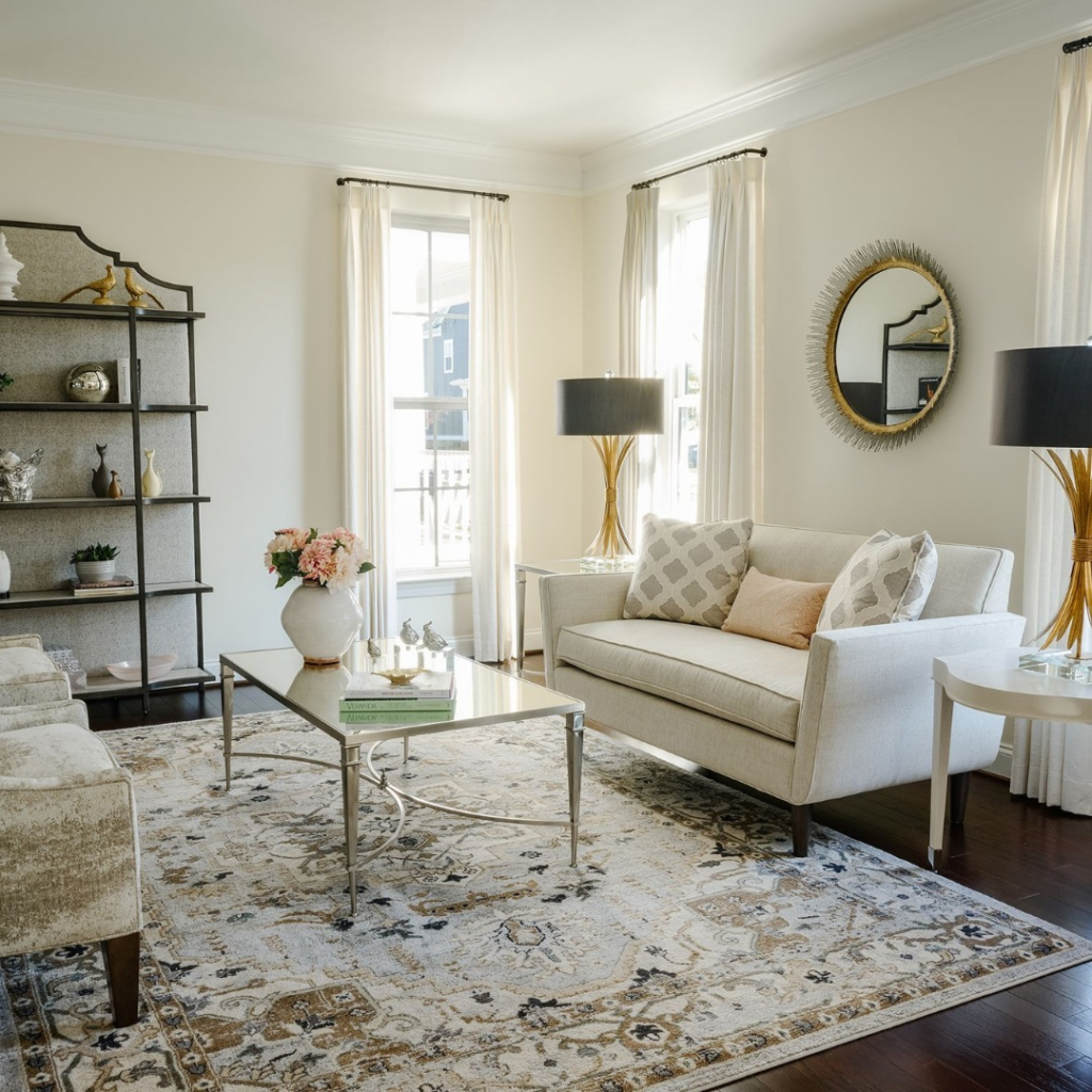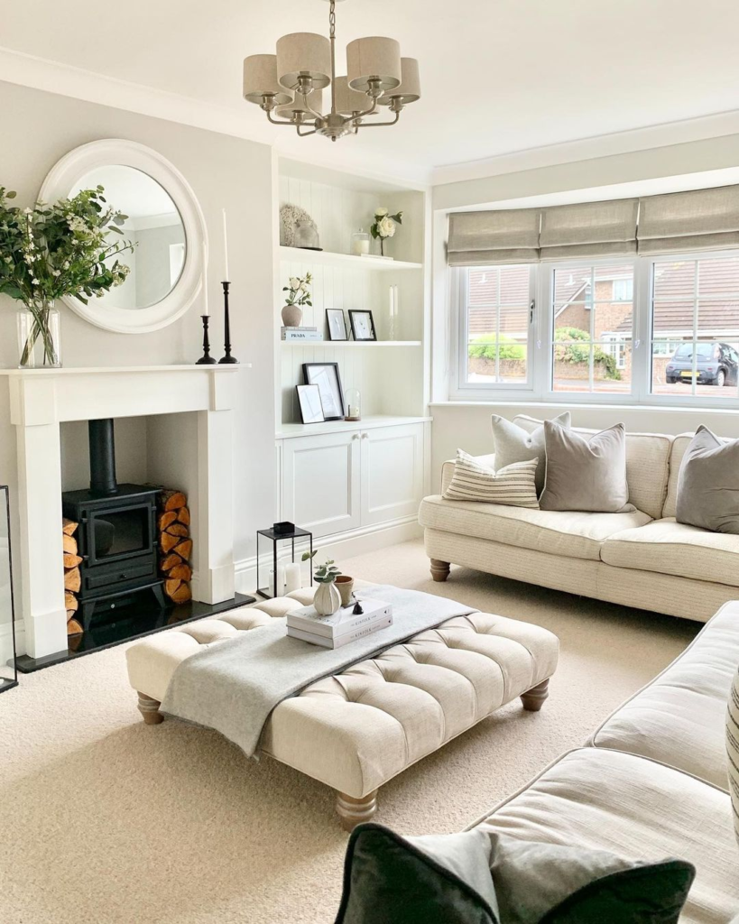 This room exemplifies refined elegance, blending cream hues with traditional design. A stately mirror reflects the room’s balanced symmetry, while a tufted ottoman anchors the space in classic style. Soft textures and greenery add a touch of warmth to the structured aesthetic.