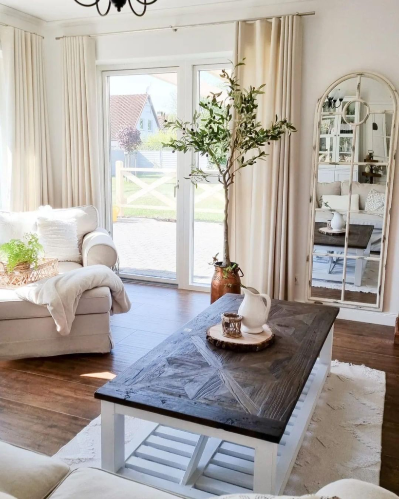 A rustic wooden coffee table introduces character to this airy cream living room. The soft drapery and white sofa create a light, open space, while a tall olive tree adds a touch of nature. These elements combine to curate a relaxed, rustic vibe.