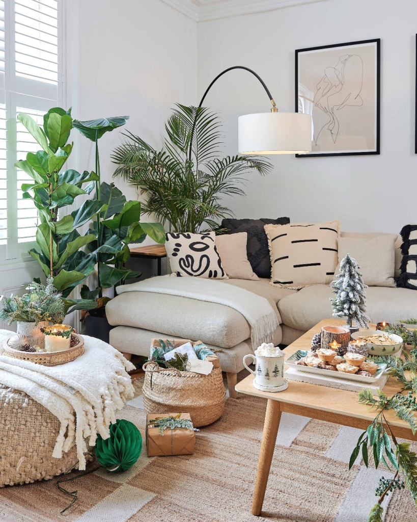 Cream tones anchor this space, where holiday accents infuse a festive spirit. Lush greenery and playful pillow designs add a personal, homely touch. The overarching theme is a comfortable and cheerful space ideal for gatherings.