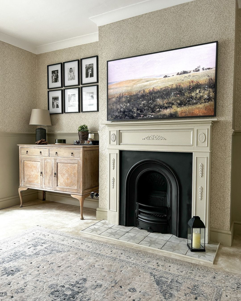 This cream living room evokes the past with a vintage wooden sideboard and classic fireplace. The patterned wallpaper adds a touch of genteel sophistication. A cluster of black-framed photographs introduces personal history. Overall, the space combines nostalgic elements with the softness of cream for a timeless allure.