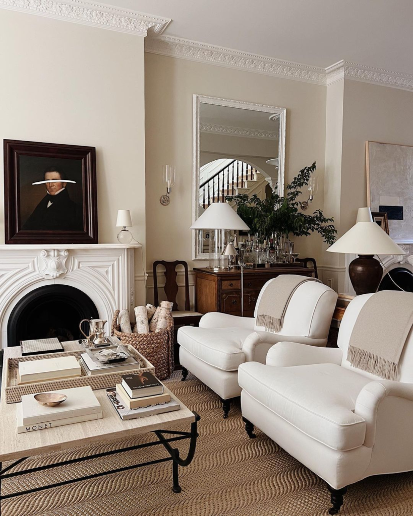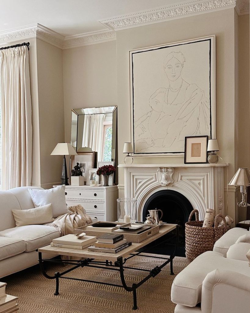 Cream meets classic elegance in this room, where textured cushions and an ornate ceiling capture the eye. The fireplace, adorned with eclectic objects, serves as the room’s centerpiece. Tradition and texture blend gracefully within a cream palette.