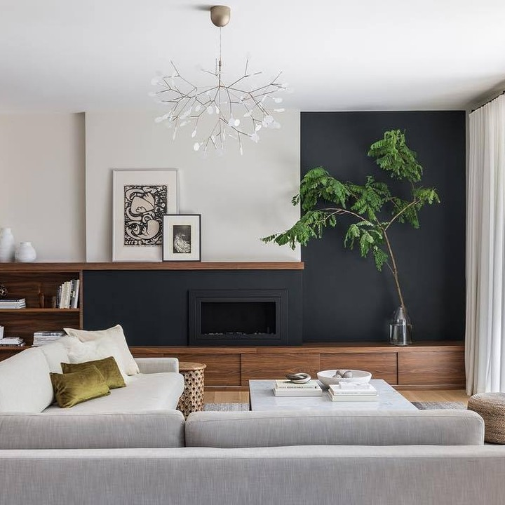 This living room effortlessly combines sleek sophistication with a touch of natural warmth. The bold black accent wall provides a dramatic backdrop for the creamy plush sofa and wooden elements, creating a striking contrast. Greenery strategically placed throughout adds vibrancy, bridging modern chic with organic serenity. The distinctive chandelier and eclectic artwork infuse the space with personality, ensuring it feels both curated and inviting.