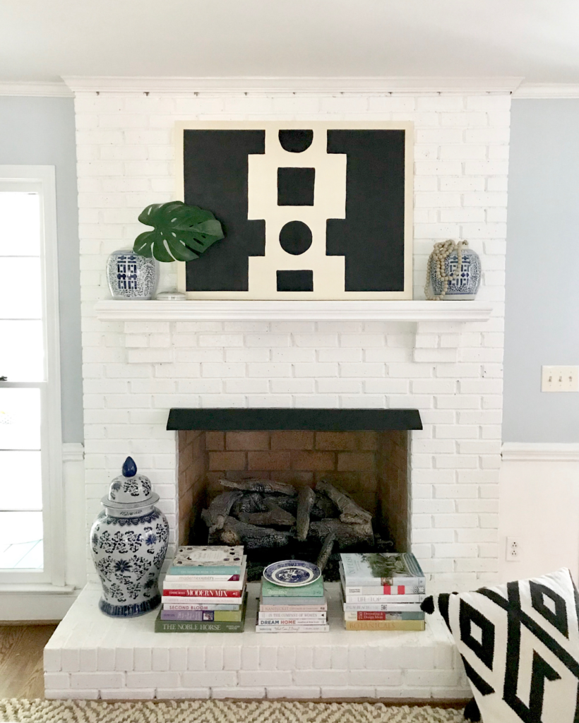 Blending classic charm with contemporary design, this living room centers around a pristine white brick fireplace. Above, a striking black and white artwork anchors the room, while traditional blue and white porcelain adds a nod to heritage. A leafy green plant offers a splash of natural color, and a geometric cushion introduces a modern edge. The result is a harmonious mix of old and new, creating a space that is both comfortable and stylish.