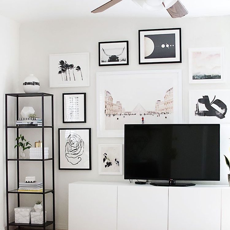 Transforming into a sophisticated gallery, this living room showcases an eclectic array of monochromatic art. The clean white walls serve as a canvas for a carefully curated collection of abstract and serene landscape pieces. A minimalist black shelving unit adds functional elegance, complementing the sleek media console below. Together, these elements create a modern space where art takes center stage, demonstrating the striking power of simplicity.
