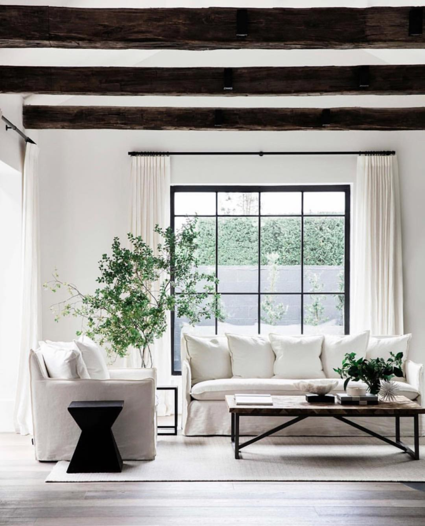 In this living room, the blend of rustic and modern elements creates a unique ambiance. Stark black window frames contrast with the crisp white walls, while exposed wooden beams add warmth. The simplicity of the décor, highlighted by a bold black side table, achieves a balanced and tranquil atmosphere. This setting beautifully illustrates the impact of contrasting textures and colors in a minimalist space.