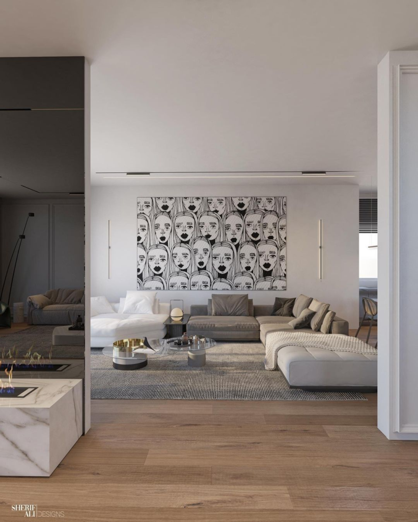 This living space showcases a sleek monochrome palette, highlighted by a statement art piece that contrasts dramatically with the muted tones. The lush textures of the furnishings add a layer of sophistication, while metallic accents subtly inject a hint of sparkle. The expansive white sofa invites relaxation and comfort, making it a prime example of balancing bold graphics with understated luxury.