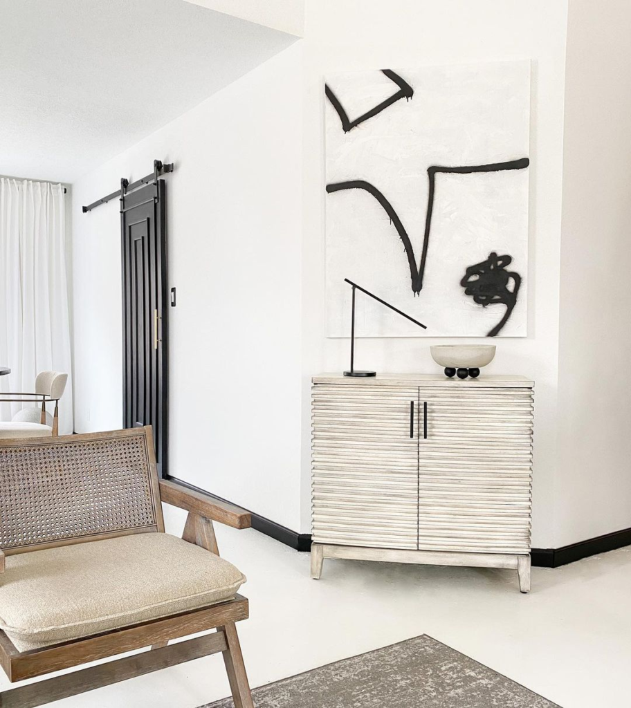 A striking black and white abstract painting serves as the focal point in this minimalist living room. The space is defined by a sleek, textured cabinet and a modernist chair, combining functionality with artful design. Clean lines and monochromatic hues create a sophisticated and harmonious ambiance, proving the elegance of simplicity and the significant role of art in interior design.