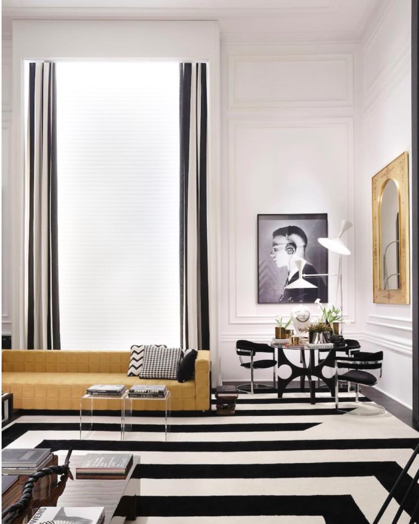 In this black and white living room, a bold geometric rug provides a dynamic visual foundation. A mustard yellow sofa introduces a vibrant pop of color against the monochrome backdrop. Portrait and paneled walls add depth, while striped curtains enhance the room’s sense of grandeur. This setting celebrates patterns and masterfully balances vibrant accents with classic elements.
