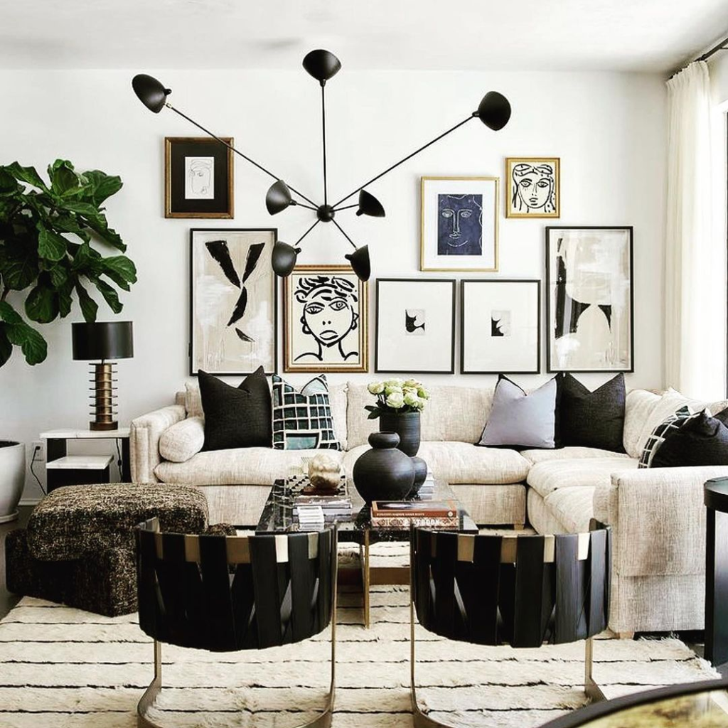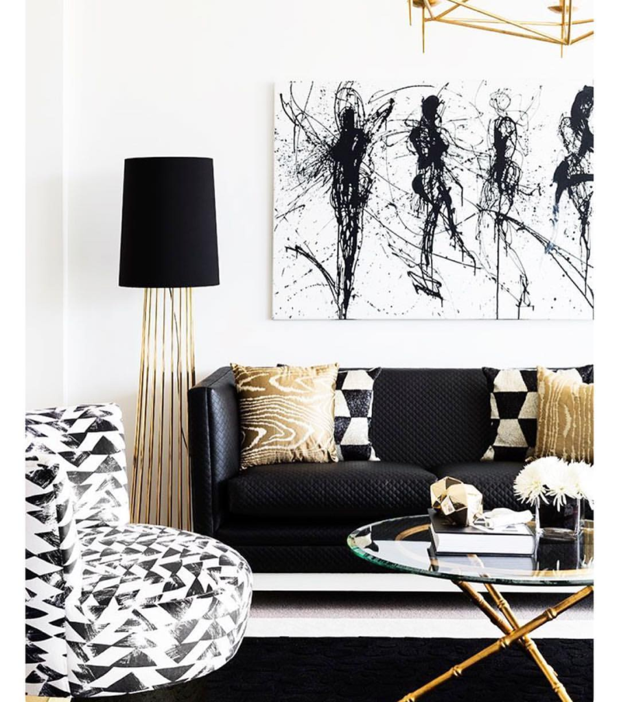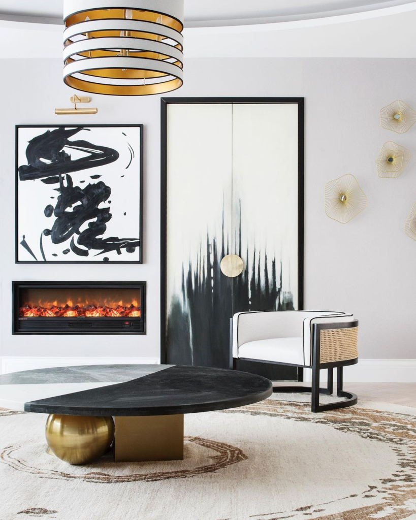 Dynamic abstract black and white artwork serves as a focal point in this living room, setting a striking tone. An elegant gold-accented light fixture adds a touch of luxury, while a sleek black coffee table grounds the space. The neutral rug softens the room’s contrasts, creating a balanced and sophisticated look.